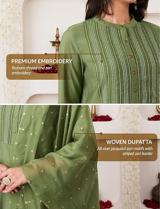 • This elegant 3-piece salwar suit set features a regular-fit kurta with exquisite zari-embroidery & gold metal button placket, straight-fit pyjama and dupatta featuring gold jacquard motifs.